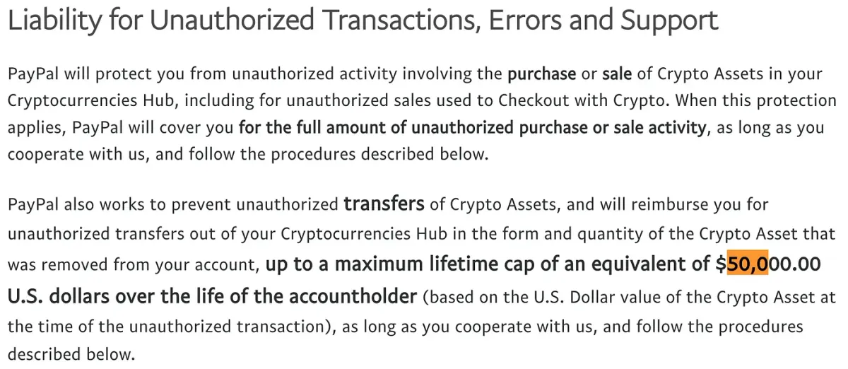 PayPal yesterday announced that the feature it had enabled last year for PayPal customers enabling normal crypto network transfers was now being enabled for Venmo customers. To me, the announcement was pretty mundane, but the PayPal representative did point out that PayPal already offers $50,000 of coverage for EFTs. Looking at PayPal’s cryptocurrency account terms, PayPal says it will “protect you from unauthorized activity involving the purchase or sale of Crypto Assets in your Cryptocurrencies Hub, including for unauthorized sales used to Checkout with Crypto” and will reimburse customers for “up to a maximum lifetime cap of an equivalent of $50,000.00 U.S. dollars over the life of the accountholder.”