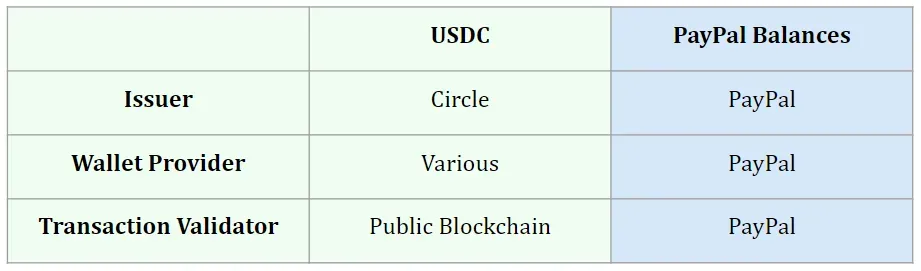 The comparison of USDC with PayPal balances is apt because both are assets that establish proprietary payments networks. However, the networks do differ in two important ways which, in my opinion, reveal the new paradigm created by public blockchains. First, use of USDC is permissionless whereas all users wishing to use PayPal must register. Second, the services required for consumers to use USDC are disaggregated whereas in PayPal they are consolidated.
