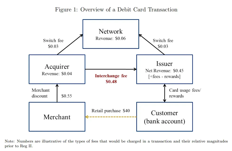 Someone I know is fond of saying about new payments products, “it’s all about the interchange, baby” (this applies to most fintechs, too). Interchange is the fee that the card networks charge merchants for payments using cards. According to research by the Kansas City Fed, merchants in the US pay on average 1.5–2% for the service of accepting card payments. In practice, this figure may be higher because of card processing fees layered on top of interchange costs. Interchange revenue is split between the card networks, card-issuing banks, and other parties involved in the transaction.